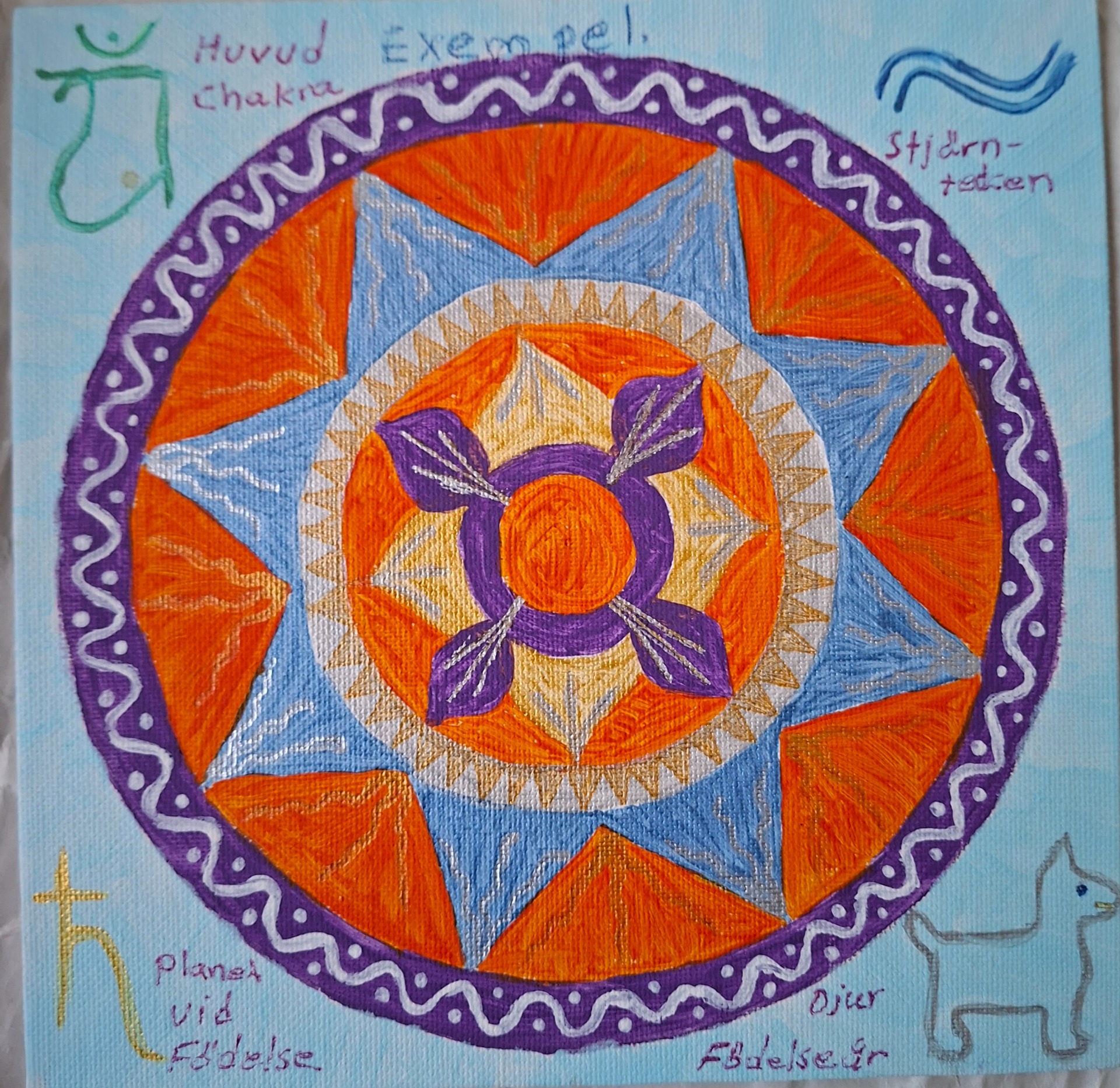 Exempel hur en färdig Mandalas kan se ut med olika symboler ditmålade. Tolkning av tavlan är på ca 3 st A4 sidor,